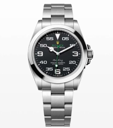 First created in 1945 to honor the achievements of Britain’s Royal Air Force, the Rolex Air King has remained true to its origins, evolving into one of the most iconic pilot’s watches. It features a black dial with bold white Arabic numerals and an inverted triangle at the 12 o’clock mark, a hallmark of great pilot’s watches. The 40mm Oystersteel case and bracelet ensure durability and style. The latest model boasts a Superlative Chronometer Caliber 3230, with an antimagnetic escapement, a 70-hour power reserve, and enhanced shock resistance.