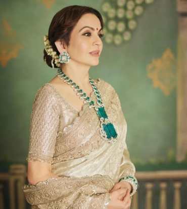 Nita Ambani has always been in talks for her wardrobe collection consisting of some of the most valuable outfits. Her love for traditional outfits, especially sarees is well-known. However, this one saree designed by Sivalingam, the director of Chennai Silks is worth Rs 40 lakhs and has been given the title of world’s most expensive saree, India.com reported. The saree is adorned with real diamonds, and gold and also features rare gemstones like ruby, pukhraj, emerald, pearls, and others. The highlight of this saree was its blouse which has a picture of Lord Krishna embroidered in it.