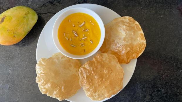 Aamras, a dish cherished in the western states of India like Maharashtra and Gujarat, is a mildly sweetened mango pulp often paired with puris.
