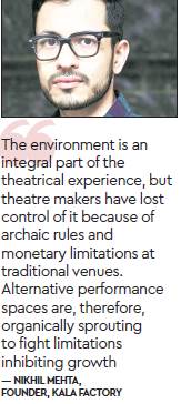 “The environment is an integral part of the theatrical experience. It’s one of the fundamental factors differentiating theatre from film. But theatre makers have lost control of the environment because of archaic rules and monetary limitations at traditional venues. Alternative performance spaces are, therefore, organically sprouting all over the city to fight limitations inhibiting our growth,” says Nikhil Mehta, founder, Kala Factory. Mehta is a well-known theatre director. He was assistant director for the recent play, Sunday in the Park with George, at New York City Center, starring Jake Gyllenhaal, and assistant to Vishal Bhardwaj for the film Rangoon.