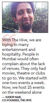 Similarly, the husband-wife duo of Sharin Bhatti and Sudeip Nair opened The Hive in Bandra, Mumbai, in 2010. A small room initially, The Hive would host book sales and open-mic poetry nights. Today, it’s a 4,000-sq-ft space. After opening The Hive, the couple decided to start another platform, The Cuckoo Club, for big-scale productions. “At both venues, we are trying to marry entertainment and hospitality. People in Mumbai would often complain about the lack of venues. They only had movies, theatre or clubs to go to. We started with one-two events a week. Now, we host 25 events at The Hive on the weekend alone,” says Nair, who has a background in hospitality.