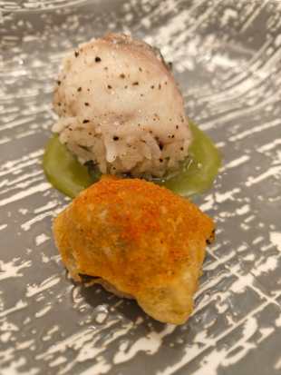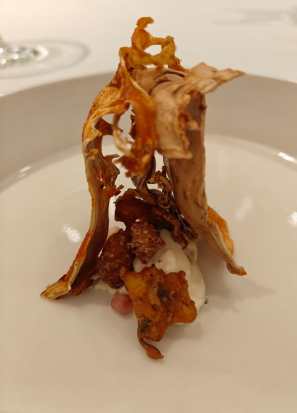 The 13-course menu starts with Stir Fried Chicken – a creamy buttermilk mousse offset by the crunch of curry leaf tempura. The chicken is stir-fried with restraint, a nod to Southern pan techniques. But it’s the tempura that lingers. Light as air, yet humming with flavour. A statement opener!