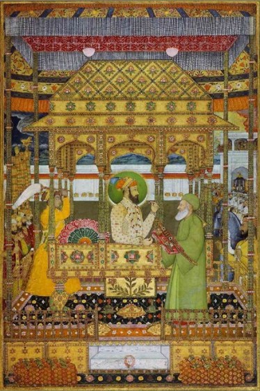 From the sixteenth century onwards, Indian art from the royal courts serves as pictorial evidence of the country’s opulence, and cultural sophistication. The early paintings from the Mughal court depicting Emperor Babur and his son Humayun are simple portraits of them sitting on slightly raised platforms or rugs with manuscripts, pen boxes, some fruits in their front and huge Mughal cushions behind them. The paintings from Emperor Akbar and Jehangir show the development of art with artists like Abd al-Samad, Bichitra, Dasvant and Basavan and others depicting court scenes, ceremonies, hunts, battles. The Persian influence in these paintings cannot be denied if one considers the accompanying text in Persian and the exquisitely finished borders. The splendour of the Mughal court is defined by the paintings from the period of Shah Jahan and later emperors because they feature the famed Peacock Throne, which was carried off to Persia in 1739 by Nadir Shah. A 1774 painting of Gentil Album, Faizabad featuring an unknown emperor shows the marvellous throne placed on a raised marble platform in its entirety.