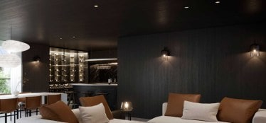 The interior features black wood that covers the walls and ceiling. The terrace will have a lawn and a patio area along with an open kitchen and a dining area.
