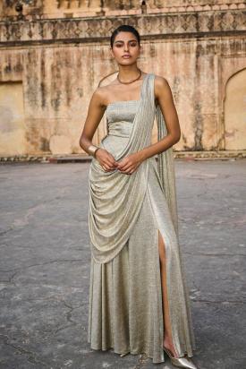 For brides seeking a look that’s both ethereal and effortlessly elegant, this fit-and-flare, off-shoulder gown blends modern glamour with a hint of cultural homage, making it a beautiful option for a beach wedding. Crafted in a shimmering champagne and gold knit fabric, the silhouette is classic yet contemporary, with a flattering fit-and-flare cut that hugs the torso before flowing out gently. The off-shoulder neckline accentuates the collarbone and shoulders, remaining romantic and timeless.