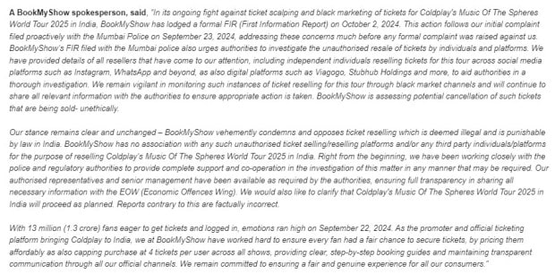 On Friday, October 2, 2024, BookMyShow filed a case at Vile Parle Police Station in Mumbai, accusing unidentified persons of engaging in the black marketing of Coldplay tickets. The British rock band is set to perform at DY Patil Stadium, Navi Mumbai, on January 17, 18, and 19 next year.