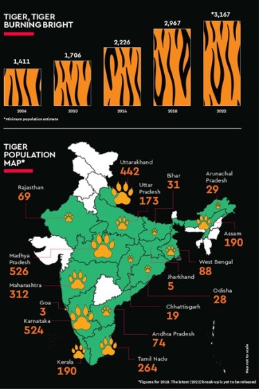 According to the National Tiger Conservation Authority (NTCA), India is home to over 70% of the world’s tigers. Since 2006, every passing census shows a steady increase in tiger population — 1,411 (2006), 1,706 (2010), 2,226 (2014), 2,967(2018), and 3,167 as of 2022. Take for instance, the substantial rise in tiger population in Shivalik and Gangetic floodplains with a total of 804 tigers, higher than the estimated population of 646 in 2018, indicating free movement of tigers populating newer habitats.