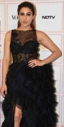 She was seen in an offbeat choice, not one which you generally expect her to be in. Sara donned a black ruffled gown with smokey makeup and sleek hair. She definitely turned up the temperatures with this look and established herself as a fashionista.