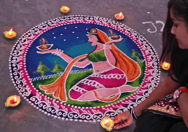 Many of you will agree with me if I say Diwali besides being the festival of lights is also an occasion which celebrates colour. Houses boasting of colourful lights, flowers adorned doorsteps and not to forget the spectacular rangolis. The colourful rangoli which adorns almost every household is an important part of the traditional festival. Rangoli tends to be the centrepiece of every household and everyone strives to bring out the best of their creativity to enhance the masterpiece. Rangolis are made with varied materials like special rangoli powders, rice powder, flowers and diyas and people invest hours to create it. These days coloured rangolis have taken a back seat and people use innovative ideas and materials to make rangolis even more attractive. Earlier, rangoli was a time taking process and needed hours of effort. These days you can also make use of the stencils widely available in the market. In case you still have a dearth of good rangoli ideas, here we have some quick ones for you; take a look: