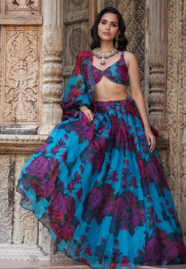 Step into the festive mood with this stunning turquoise floral lehenga set by Astha Narang. With its retro-inspired floral prints and vibrant hues, this ensemble beautifully blends contemporary style with traditional charm. It’s the perfect choice for those who love a fusion of classic elegance and modern flair. Embrace the festive spirit with Astha Narang’s exquisite turquoise floral lehenga set. Featuring retro-inspired floral motifs and vibrant hues, this ensemble masterfully fuses contemporary style with traditional allure. Ideal for those who appreciate the blend of timeless elegance and modern sophistication, this set is the perfect choice to make a statement this festive season.
