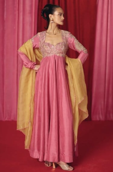 The epitome of festive fashion, this pure silk anarkali features signature zardosi and pearl embroidery. With a vibrant palette and a butter yellow organza dupatta adorned with flamingo pink resham-sequin bandhani, this outfit is sure to make any celebration more special.