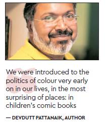 In an article, Modern Mythmaking, author and mythologist Devdutt Pattanaik reflects on how, “we were introduced to the politics of colour very early on in our lives, in the most surprising of places: in children’s comic books.” The comical depictions of Indra, Brahma and Durga have them in pink skin tones while the demons, Asuras and Rakshasas, are painted brown. And Vishnu, Ram and Krishna are blue. The article further states that “somehow, an unnaturally blue Krishna was preferred over a naturally dark Krishna. Because blue is the colour of the sky, of ether, of divinity.”