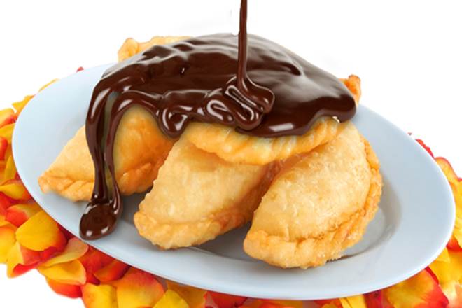 Make the gujiya dough with flour, ghee and salt. Add water and make a firm dough. In an pan, cook mava till its brown. Then add sugar and cook. Add cardomom powder annd chocolate chips when the mixture cools. Mix well. Now, take a small piece of the dough and put it on your hand. Now, fill the chocolate mixture, and seal the dough with a little water. Now, fry the gujiyas till they are golden brown. When gujiya is cooked, soak it in sugar syrup. Garnish with chocolate syrup, cardamom and serve.