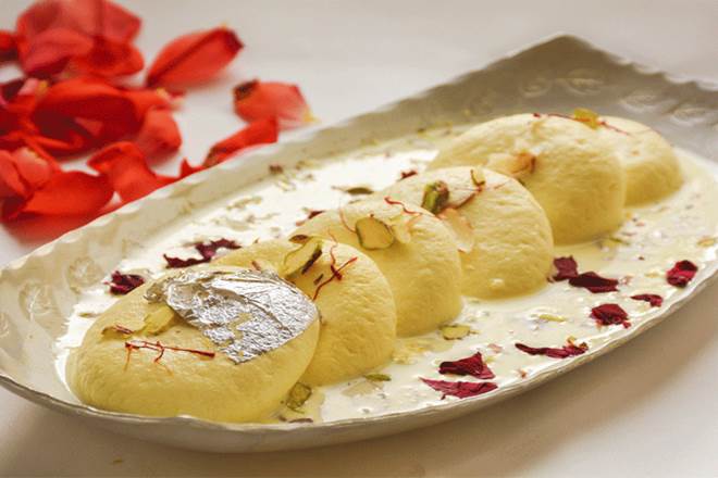 In a pan, boil milk for 4-5 minutes. Switch of the flame, and add lemon jiuce and stir gently till it curdles. Strain the paneer in a muslin cloth. The, place the muslin cloth with paneer in fresh water and mash for 1-2 minutes. Tie and hang it for half and bour till the extra water drains out. Then remove the panner from the muslin cloth and knead the paneer till it is smooth and soft. Then divide the paneer mixture into 10 equal portions, roll and flatten it. Keep it aside. Now, in a steamer, put 5 cups of water, add sugar and boil it till sugar completely dissolves. Put panner balls into sugar syrup and steam for 8-9 minutes. Switch off the burner and let it stand for half an hour. Now, remove the rasgolla from the sugar syrup and squeeze them gently and add to the saffron milk. Refrigerate till chilled and serve with chopped pistas and almonds.