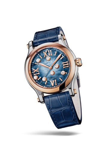 The Happy Sport collection welcomes three new creations in a delightful palette of blue. These sporty-chic watches feature a modern look and suggest a more relaxed way of wearing diamonds by integrating them into the hectic pace of everyday life. The first model, in steel with a 30 mm diameter, is adorned with a dial whose sky blue hue serves as a backdrop to the whirl of three dancing diamonds. The two other timepieces, with their larger 36 mm diameter, combine stainless steel with details in ethical 18-carat rose gold, while their dials and leather straps are attired in different shades of blue.