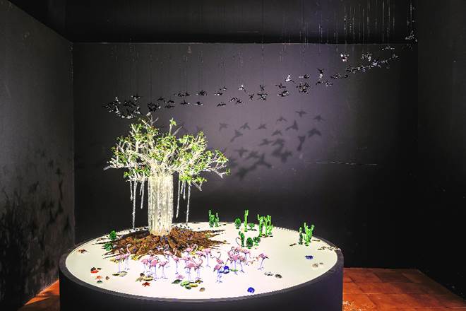 From the vastness of the universe to the smallest of living beings, blown glass does justice to it all. An art work called Utopian World: Sentient Beings celebrates every living being’s existence on this planet. Dainty glass replicas of insects, reptiles, birds, plants sea dwellers, and more are a visual delight. The message by artists Swagata Naidu, Rajesh Sharma and Zafar Ahmed is one of equality, that even if man is superior to others, they all deserve the right to share all of nature’s resources equally, receiving and giving in equal measure. Only, the thought in today’s circumstances is utopian, with humans usurping most resources of the earth, leading to extinction of hundreds of species everyday.