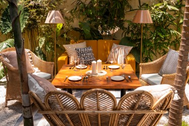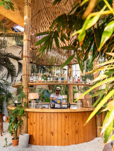 Bamboo and local Chira stone are the highlights of the architectural framework at Kaia. Even while the place is covered with waterproof plastic to keep it safe from rain, the tropical beach vibes have not been compromised. With Spiro Spero and Keith Menon’s expertise, the onsite coconut palms and trees were saved and used in an organic design with minimal use of intrusive construction material.