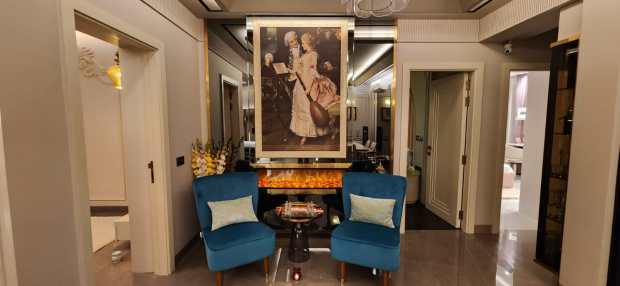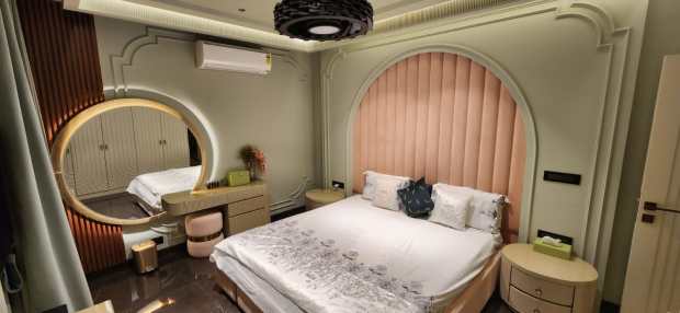 The bedrooms offer a serene sanctuary, featuring an opulent canopy bed adorned with lavish fabrics that beckon peaceful sleep. The interplay of textures and patterns, evident in the silk drapes and intricately crafted wallpaper, cultivates an ambiance of refined luxury. The king-size bed, graced by an elegant pink backdrop, is complemented by chic oval-shaped side tables. An oval mirror harmonizes with a platform-style dressing table, enhancing the room’s sophistication.