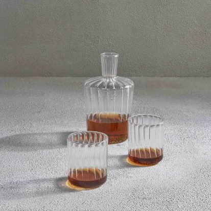 With its wide body and ribbed detailing, this borosilicate glass whisky decanter will match most aesthetics. It is ideal for formal entertaining occasions. Fill with your best whisky and pour into classic lowball glasses like the Élan Old Fashioned Glass.