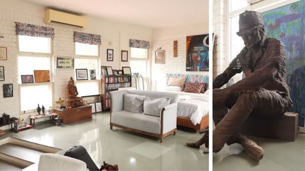 Shroff also gave Khan a tour of his daughter, Krishna Shroff’s, room. Designed in an open maximalist aesthetic, you can spot several wall hangings and frames from the decor. Airy and well-lit, natural light has been prioritised in the architecture of the farmhouse. There was also a signature room decor piece in the room made of wood. It was a functional piece made of wood and looked as though Shroff was sitting in the room.