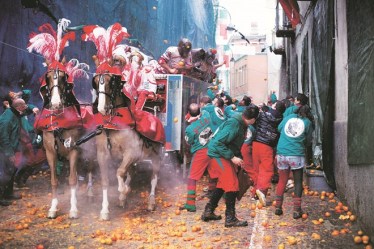 The Carnival of Ivrea is a festival in the Northern Italian city of Ivrea, which includes a tradition of throwing of oranges between organised groups, known as the ‘Battle of the Oranges’. It is the largest food fight in Italy and surrounding countries. The core celebration is based on a locally famous Battle of the Oranges that involves some thousands of townspeople, divided into nine combat teams, who throw oranges at each other – with considerable violence – during the traditional carnival days: Sunday, Monday and Tuesday. Originally beans were thrown, then apples. Later, in the 19th century, oranges came to represent the stones thrown at the king’s castle in order to demolish it. In 1994, an estimated 265,000 kg of oranges were brought to the city, mainly coming from the leftovers of the winter crop in southern Italy.
