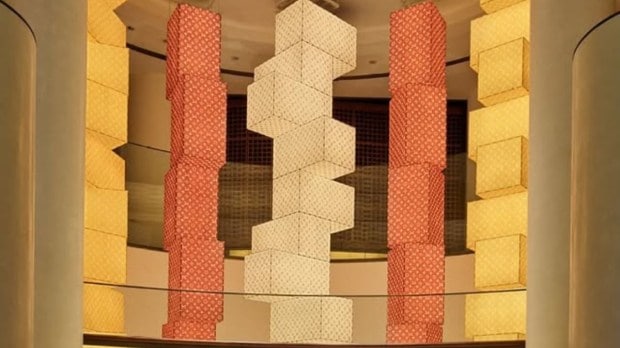 The dramatic installations are just one part of the immense store. Opening to an astonishing cube display, it merges the modern silhouette with the classic LV heritage. Monogrammed, these columns are crafted from hanji, a traditional mulberry paper. Inspired by the Korean interiors ‘seakdong’, it features colourful vertical stripes – bringing a vibrant vibe to the interiors.