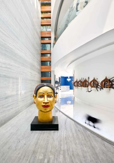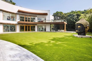 The house itself breaks away from the monotonous rectangular structures typical of modern cities. Architectural Digest, in a 2017 feature, described it as a “sweeping curve of a home”—a graceful boomerang shape that overlooks a meticulously manicured lawn. One of the home’s most striking features is a 25-foot Buddha head sculpture by renowned artist Subodh Gupta, standing prominently in the garden.