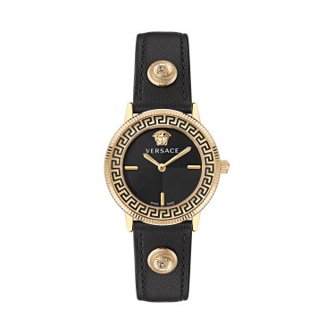 This new iconic case recalls the famous patterns used in the Versace accessories. The Medusa studs on the leather strap, the enameled Greca decorating the top ring, and the Versace patterns, they all give a strong personality to this watch collection. To flag the Lilac leather strap version, in line with the latest RTW colors and the Red one. The latter features diamonds as indexes, which give an additional touch of glamour and refinement.