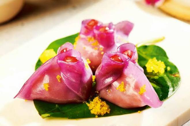 Also in Gurugram, Viet:Nom serves banh bao vac, a speciality of the Hoi An region of Vietnam. Resembling a white rose, the dumpling has a translucent layer made with tapioca and is filled with shrimp paste. It’s best paired with nuoc cham, a sweet and spicy sauce. The prawn and herb dumpling is inspired by the diversity of the different herbs that are grown in Vietnam. Prawns are minced with various Vietnamese herbs (like sisho, basil, Vietnamese coriander, etc) and wrapped with a royal velvet starch covering. The dumplings are then steamed with tobiko sauce in red-orange colour to give a mild smoky taste and a crunchy texture.