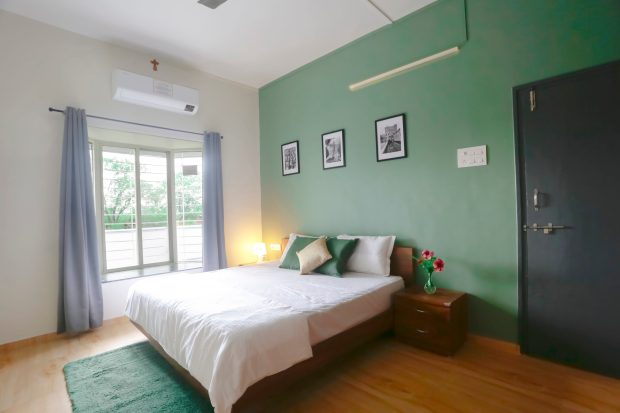 Surrounded by a sea of green, The Kihim Courtyard is a sprawling 9-bedroom property located a mere 20 minutes from Mandwa Jetty, Alibaug. With its graceful arches and pretty pops of colour, this home exudes a charming Portuguese vibe. Each thoughtfully-furnished bedroom offers blissful views of nature, while the living room, peppered with posters of classic Bollywood films, serves as a great spot to catch up with friends and family.