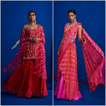 There can’t be a festive wardrobe without leheriya. This stitched lehenga saree by Pink City by Sarika works well for a day or night time party. For those who are maximalists, opt forthe embroidered kurtas with shararas with a bold leheriya dupatta. This form of craft adds gravitas to any look.
