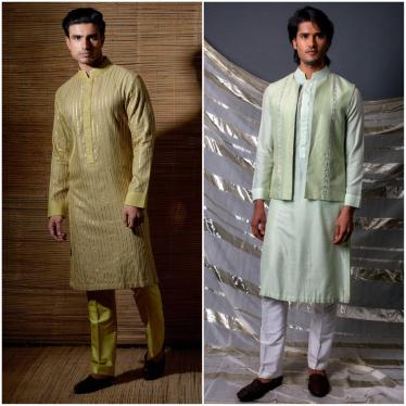 Dear men, a basic kurta can also be amped up with just a layer. Add a layer with a stole or a bandi just like this one by Kunal Anil Tanna. The designer adds a touch of glam with graphic metallic gold foil work on kurtas making them the perfect choice for Pujo. Go for pop hues and keep the rest simple and toned down.
