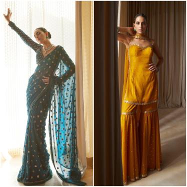 It’s that time of the year when festivities are around the corner and everything is buzzing with joy and colours. The first thing we all lookout when starting the festive fervor, is the right ensemble. The ecstasy and psychedelic patterns may be all the excitement we can hope for in this season, and so we list for you the best designers have to offer. From printed sarees to mirror-work shararas, there is something for everyone.