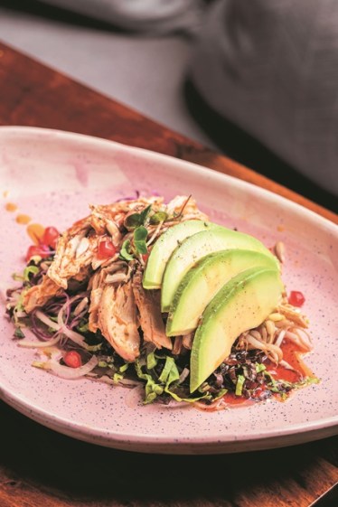 There’s a long list of starters and appetisers, best termed as small bites, that can make you feel full longer on a few calories. Start with summer fresh charcoal asparagus rice paper rolls filled with coconut mayonnaise, seasonal vegetables, vermicelli noodles, lettuce, avocado, herbs, arugula and mangoes, served with peanut sauce. It’s the perfect light bite, which can also be filled with salmon, chicken and prawns. Some of the hot-selling dishes are vegetable glass noodle dimsums, poached dumplings in tangy soy, filled with crunchy vegetables; spicy galangal (ginger’s more citrusy cousin), and sesame chicken skewers; turmeric pigmented chicken chilli dimsums that have a natural yellow tinge; and dry chilli prawns or shrimp mousse on sugarcane skewers, which are quite appetising.