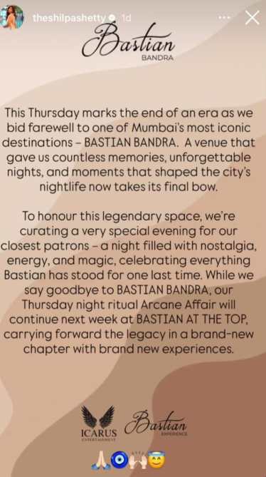 In her note on social media, Shetty wrote that Bastian Bandra will shut its operations this Thursday, on September 4. She wrote, “A venue that gave us countless memories, unforgettable nights, and moments that shaped the city’s nightlife now takes its final bow.” Before its last hurrah, Shetty announced the last evening for the “closest patrons” of the establishments. However, the actress affirmed that Bastian At The Top, another location of the restaurant in Dadar, would continue serving guests, “carrying forward the legacy in a brand-new chapter with brand new experiences,” she added.