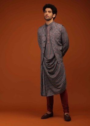 For grooms who want to break away from traditional tones and silhouettes while still keeping things festive, this vibrant look hits all the right notes. Picture a waist-length jacket adorned with bold florals or eye-catching digital prints, layered over a soft pastel kurta. The contrast between the structured jacket and the fluid lines of the kurta creates a balanced, contemporary aesthetic that’s full of personality.