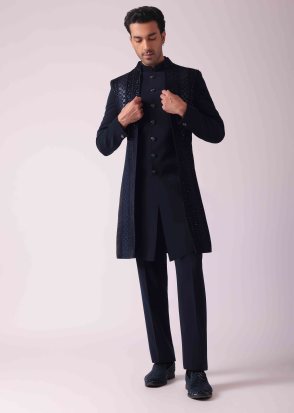 For the groom who appreciates classic elegance with a refined twist, this tailored bandhgala jacket is a standout choice. Designed with clean geometric lines, innovative cuts, and sleek concealed buttons, it’s perfect for evening events where polish is non-negotiable.