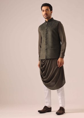 For the groom with a bold sense of style and a taste for the unconventional, this ensemble offers a refreshing detour from the expected. It’s a modern take on traditional Indian wear, where classic silhouettes are reinvented with contemporary drapes and asymmetrical cuts. The look typically features a fluid kurta, either draped or structured with an off-centre hemline, paired with cowl or dhoti-inspired trousers that bring movement and a touch of runway drama.