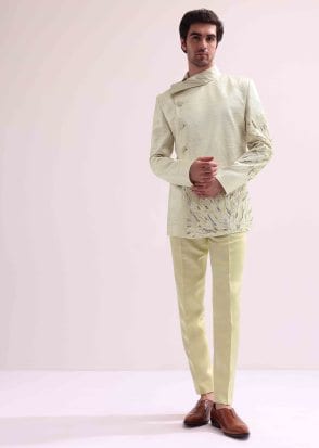 Crafted from soft muslin silk or sleek modal satin, the fabric choices ensure the outfit remains breathable and easy to wear, while still feeling elevated, making it a standout choice for fashion-forward grooms, younger wedding parties, or fusion celebrations that embrace both heritage and innovation.