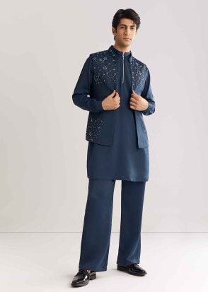 For the groom who wants to make a statement without going overboard, this ensemble offers the perfect balance of ease and elegance. A sleek, minimalist kurta serves as the base, with a floor-grazing cape that truly transforms the look, bringing in movement and drama without the weight or rigidity of a traditional sherwani. Made from lightweight viscose georgette, the outfit breathes with comfort and style, while delicate tonal threadwork adds dimension and visual interest without interrupting the understated vibe. It’s an ideal pick for mehendi afternoons or high-energy sangeet nights.
