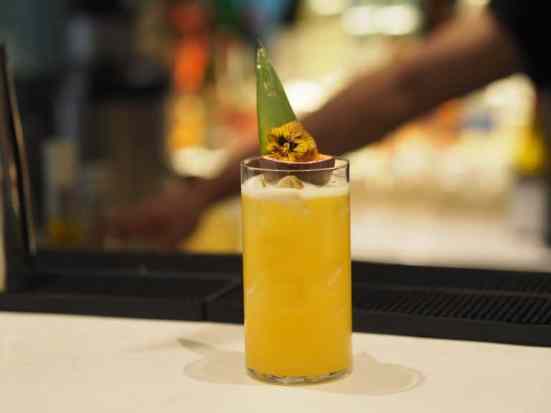 Garnish with 1 pineapple leaf, half passion fruit, and Viola flower.