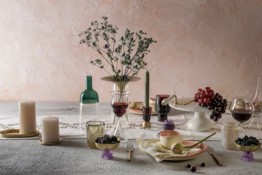 Using coloured glassware is a great way to bring a pop of colour and enhance the mood of your table. While serve-ware and vases can make a statement, glassware is important too. Consider a yellow or green-hued option to be sure your drinkware stand-out for the season.