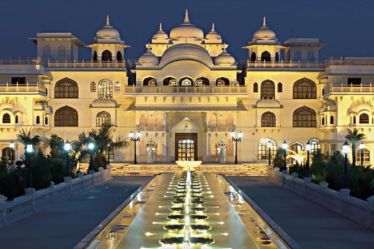 If Samode offers weathered charm, Shiv Vilas brings the opposite – a gleaming, almost theatrical take on Indian royalty. Built to mimic a grand palace, the resort plays into every fairytale fantasy with its white marble domes, gold detailing, and sweeping staircases. Located just on the outskirts of Jaipur, this resort’s perfectly polished aesthetic adds a dramatic punch to the series. The interiors are unapologetically opulent with chandeliers, gilded furniture, and ceiling murals that seem tailor-made for slow-motion entrances and dramatic showdowns.