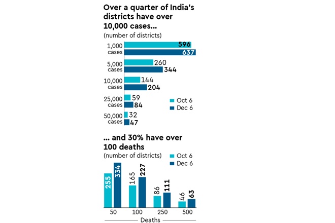 Thirty per cent of India’s districts have 100 or more deaths. On December 6, 227 districts had recorded 100 or more deaths, whereas, on October 6, only 165 districts had over 100 deaths.