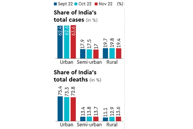 In the past month, infections in urban India increased 1.2 times while they went up by 1.16 times in rural India. Again, fatalities in rural districts increased 1.2 times compared with 1.14 times for urban districts.