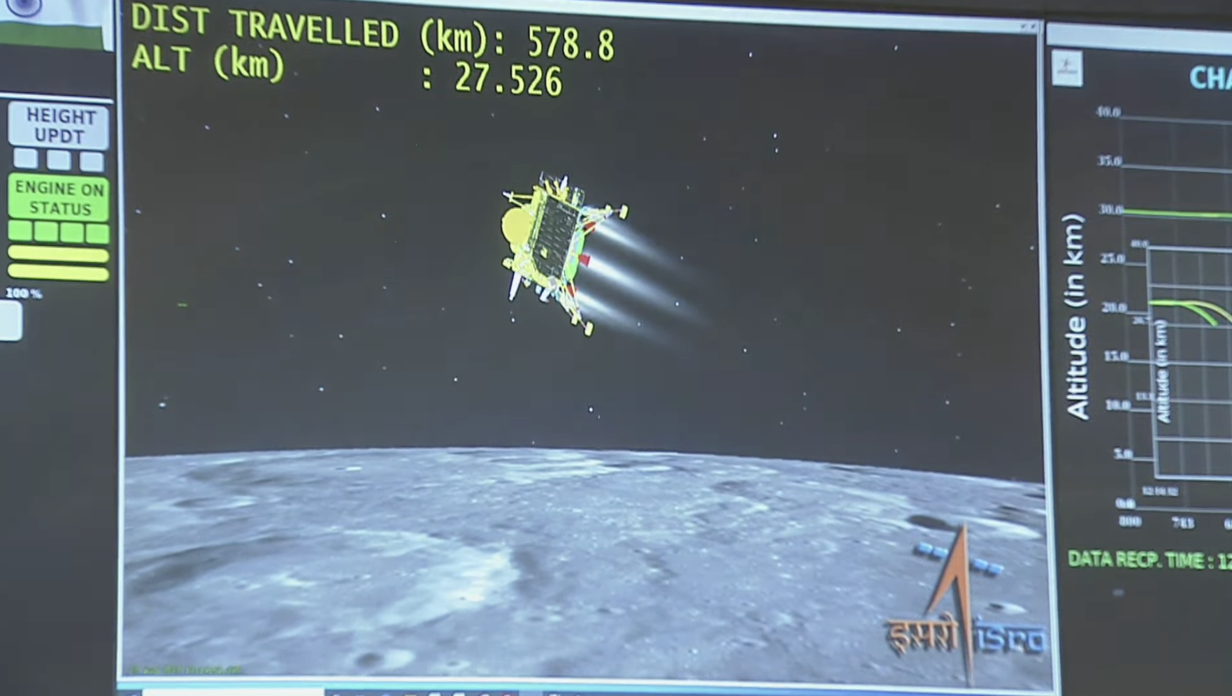 The fine braking phase is on. Lander is now just 800 metres above the surface of the moon. It's like coming in for landing on an aircraft, the altitude at which one would deploy flaps and lower the landing gear. This is that moment for Vikram Lander.