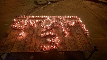 Earthen lamps are lit in a formation that reads ‘Chandrayaan’ at Assi Ghat as prayers were offered for ISRO’s lunar mission Chandrayaan-3’s successful landing on Moon’s surface, in Varanasi. (PTI Photo)