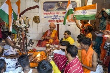 Mahant of Sri Mankameshwar temple Mahant Devaigya Puri performs 'puja' and 'havan' for the safe landing of Chandrayaan -3, in Lucknow, Tuesday, Aug. 22, 2023. (Image: PTI Photo)