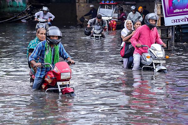 Commuters push their vehicle down the waterlogged Delhi-Gurugram Expressway service road after rainfall, in Gurugram, Thursday, Sept. 22, 2022. (PTI Photo)