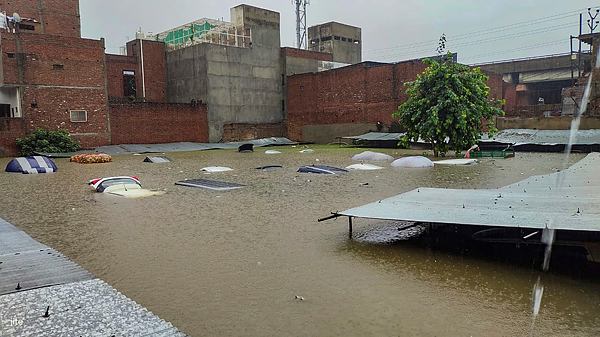 Vehicles submerged in flood water at a garage following heavy rains, in Firozabad, Friday, Sept. 23, 2022. (PTI Photo)